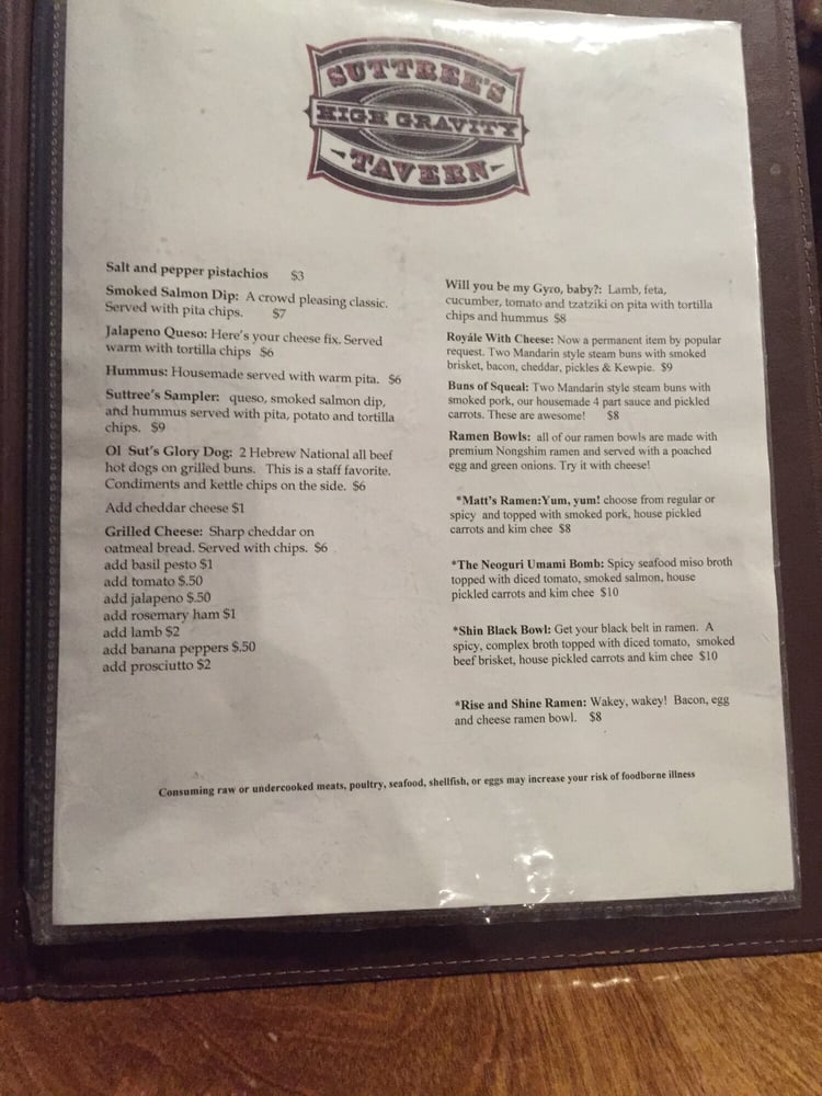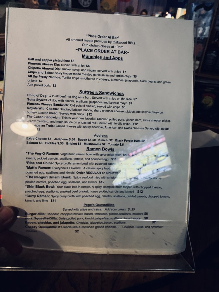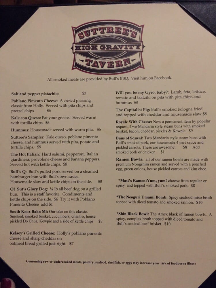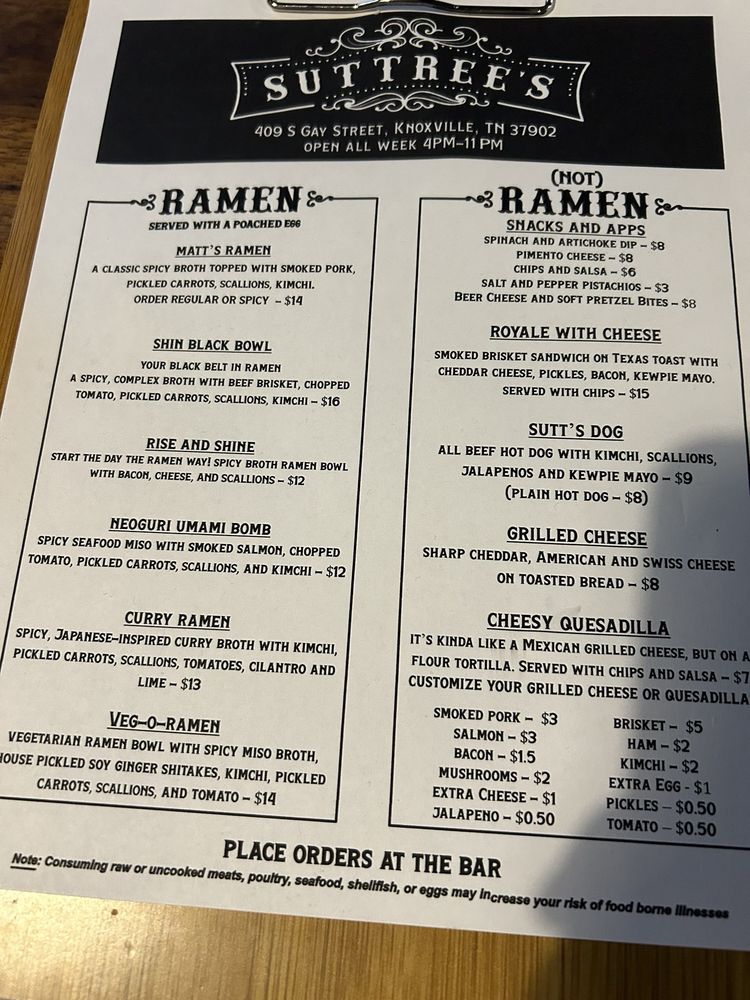 Suttree's High Gravity Tavern is a ramen and beer bar located in Knoxville, TN. This unclaimed gem offers a variety of utilities such as takeout, reservations, and a plethora of vegetarian options. With outdoor seating, a casual atmosphere, and a full bar, it is perfect for groups and late-night gatherings. The menu features delicious munchies like salt and pepper pistachios, spinach artichoke dip, and all the pretty nachos. Their sandwiches, such as the Child of Dog and Royale With Cheese, are a must-try. Don't miss out on their Pepes Quesadillas, especially the BurgerDilla and Pork SqueallaDilla varieties. Suttree's High Gravity Tavern is a cozy spot with tasty dishes and a welcoming ambiance that you'll want to visit again and again.